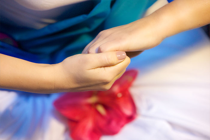 Чтобы сделать медвежий замок, расположите руки, согнутые в локтях, на уровне груди. Левая ладонь развернута от себя, правая — к себе. Сцепите ладони в замок, локти не опускаем, держим их на уровне груди.